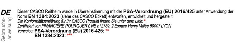 Der hier abgebildete Helm ist ein Sicherheitsprodukt aus dem Hause CASCO und wird nach strengen Qualitätskontrollen in unserem familieneigenen Werk in Europa gefertigt. Bitte benutzen Sie den Helm ausschließlich für die gemäß der im Helm vermerkten Sicherheitsnorm zugelassenen Sportarten und Einsatzbereiche und beachten Sie die spezifischen Bestimmungen für Ihr Land. Bitte lesen Sie sorgfältig die Gebrauchsanweisung. Ein falscher Umgang mit dem Helm kann zu ernsthaften Verletzungen oder gar zum Tode führen. Verwenden Sie den Helm nicht mehr, wenn Sie den Verdacht haben, der Helm könnte beschädigt sein, dies gilt vor allem dann, wenn der Helm einem Schlag ausgesetzt war. Der Helmträger ist für sein Handeln eigenverantwortlich. CASCO International GmbH übernimmt keinerlei Verantwortung für einen nicht sachgerechten Umgang mit dem Helm.
